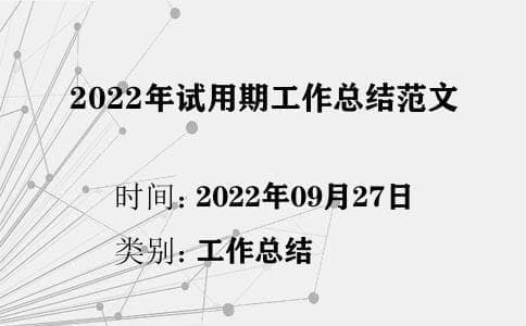 试用期快要结束的时候都会要求写一份试用期转正的工作总结用期的工作总结包含哪些内容,该怎么写呢?以下是小编精心收集整理的2022年试用期工作总结范文,下面小编就和大家分享,来欣赏一下吧。