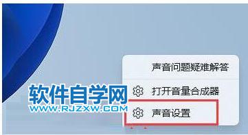 1、右键点击任务栏右下角的【声音图标】,在打开的菜单项中,选择【声音设置】;