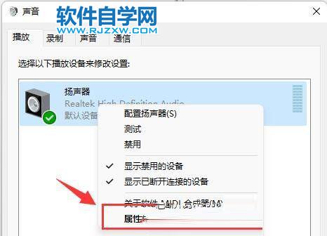 3、声音窗口,右键点击扬声器,在打开的菜单项中,选择【属性】;