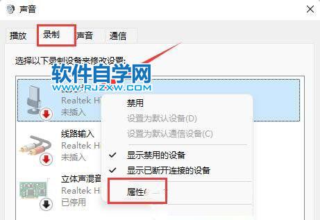 5、声音窗口下,切换到【录制】选项卡,选择麦克风后,点击【右键】,在打开的菜单项中,选择【属性】;