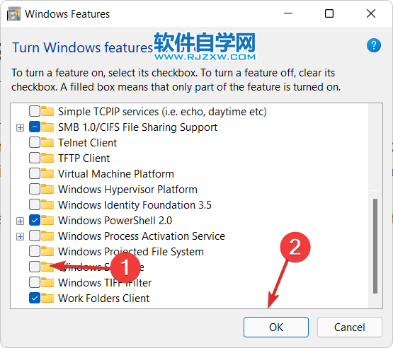 2、现在向下滚动,直到遇到Windows Sandbox功能并选中它旁边的框,然后单击OK。