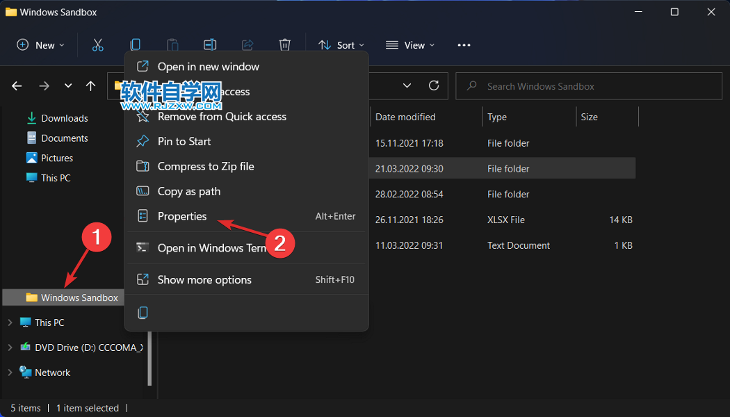 3、编辑安全属性,打开 Windows 搜索栏并输入Windows Sandbox,然后右键单击顶部结果并选择打开文件位置。现在,右键单击Windows Sandbox并选择Properties。