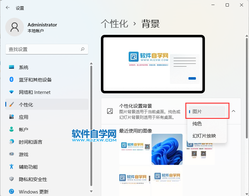 3、然后在右边的“背景”处点卡下方菜单,选择“图片”取代之前的“幻灯片放映”。